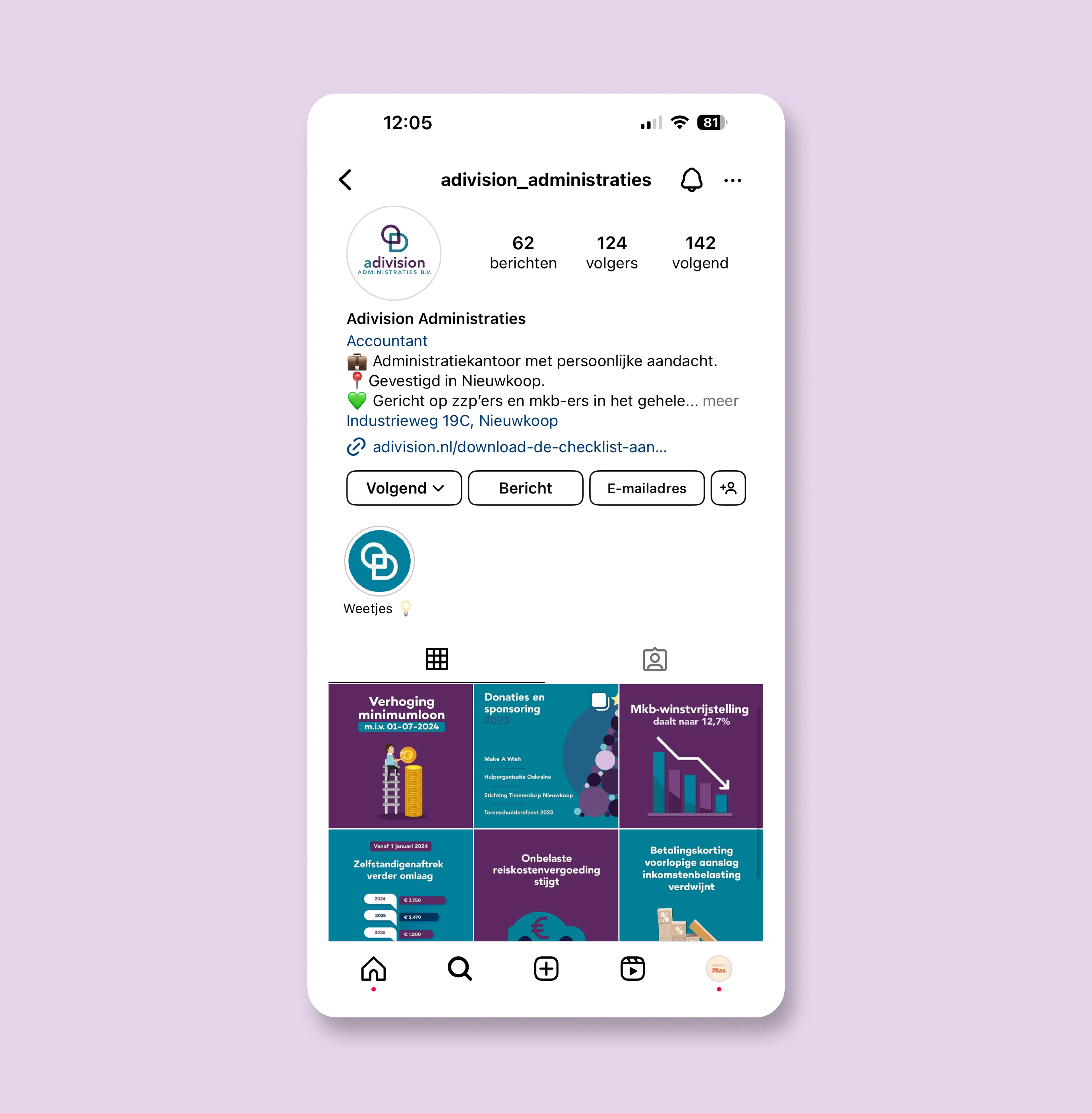 Daarnaast mocht ik Adivision ondersteunen bij het beheren en ontwerpen van hun social media kanalen. Met heldere visuals en duidelijke informatie heb ik de doelgroep geïnspireerd en op de hoogte gehouden van belangrijke onderwerpen rondom ondernemen, belastingen en actualiteiten.